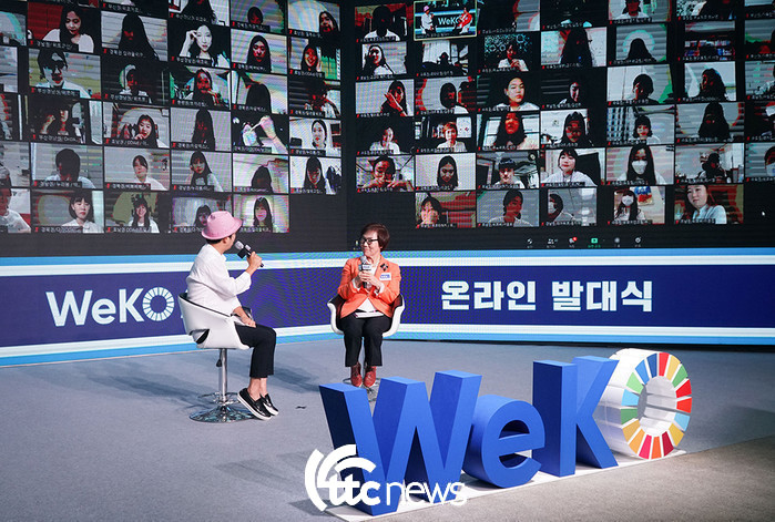 | ▲ 경기도 성남시 코이카 본부 대강당 임시 화상회의 스튜디오에서 24일 개최된 코이카 국민 서포터즈 위코(WeKO) 2기 온라인 발대식에서 이미경 코이카 이사장(오른쪽)이 사회를 맡은 개그맨 홍인규(왼쪽)와 함께 국민 서포터즈 120명과 화상회의 방식으로 실시간 쌍방향 소통하며 ‘코로나19 대응 성과와 코이카 인재상’을 주제로 토크 콘서트를 진행하고 있다(사진=코이카 제공) |
