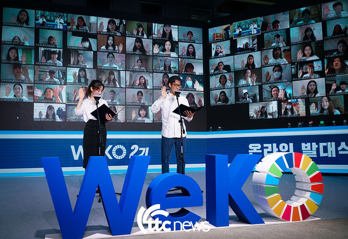 | ▲ 24일 경기도 성남시 코이카 본부 대강당 임시 화상회의 스튜디오에서 개최된 코이카 국민 서포터즈 위코(WeKO) 2기 온라인 발대식에서 대표로 참석한 위코 2기 안세정(왼쪽) 씨와 신기오 씨(오른쪽)가 선서를 하고 있다.(사진=코이카 제공) |