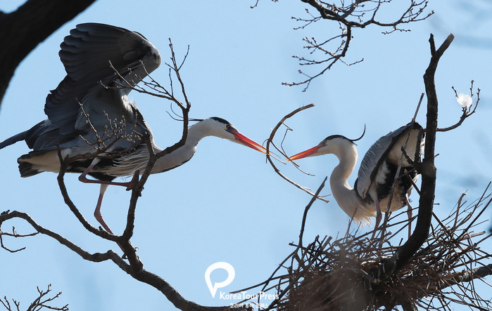절기상 낮과 밤이 길이가 같아진다는 춘분을 나흘 앞둔 16일 오전 경남 함양군 함양읍 한 왜가리 서식지에서 왜가리가 봄 햇살을 받으며 분주하게 둥지를 만들고 있다.