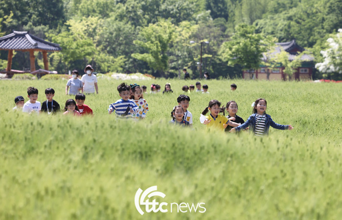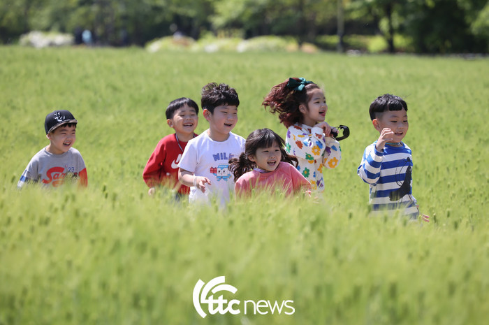 | ▲ 3일 경남 함양군 상림공원을 찾은 어린이들이 청보리밭 사이를 뛰놀며 즐거운 시간을 보내고 있다.(사진=함양군 김용만 주무관 제공) |