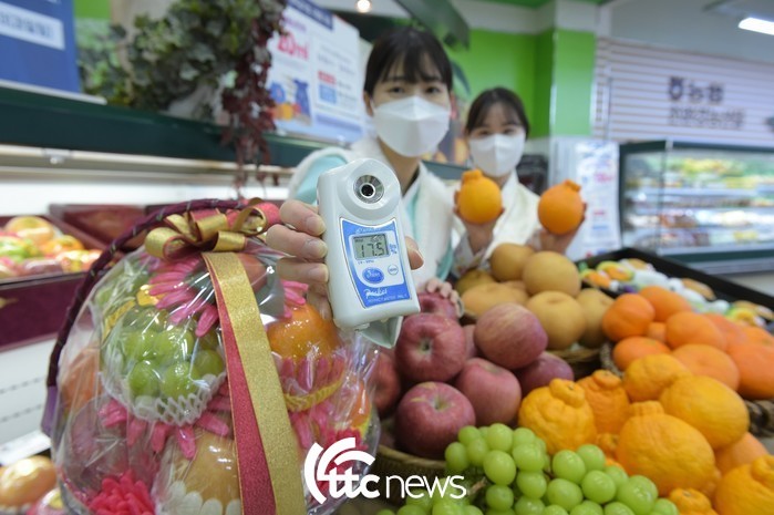 농식품 전문매장 농협 하나로마트를 운영하는 농협유통은 임인년 설 명절을 앞두고 과일 선물세트의 당도를 직접 측정하며 선물세트 구매 고객의 눈길을 사로잡고 있다.