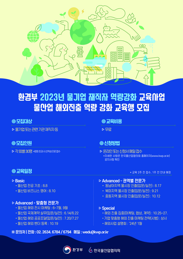 2023년 ‘물산업 해외진출 역량 강화 교육’은 Basic(2개), Advanced(권역별 3개, 맞춤형 6개), 스페셜 과정(4개) 이 운영된다.