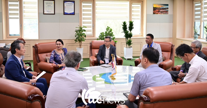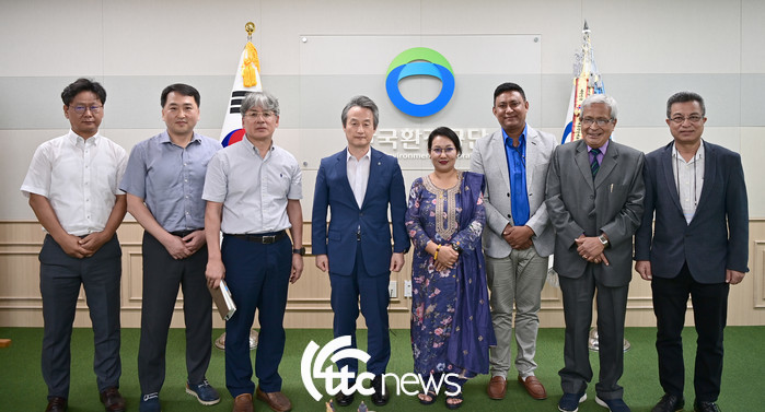 | ▲ 안병옥 한국환경공단 이사장이 (왼쪽 첫 번째) 25일 한국환경공단 본사에서 네팔 연수단을 만나 환담하고 있다.(사진=한국환경공단 제공) |
