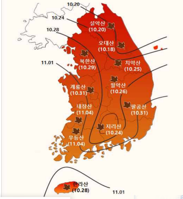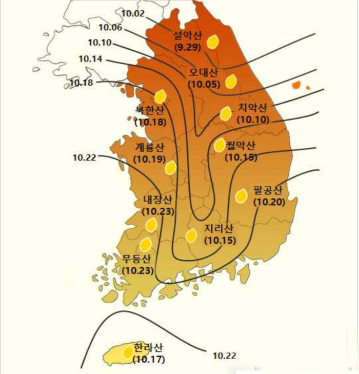 첫 단풍은 하루 약 20~25km의 속도로 남쪽으로 이동해 중부지방은 9월 29일에서 10월 19일 사이, 남부지방은 10월 15일에서 10월 23일 사이에 나타나겠다.