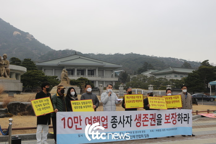 | ▲ 22일 오전 청와대앞에서 여행업생존 비상대책위원회(공동위원장 한국여행업협회 오창희 회장, 서울특별시관광협회 남상만 회장)가 10만 여행업 종사자 생존권을 보장하라는 성명을 발표하고 기자회견을 열고 있다. |