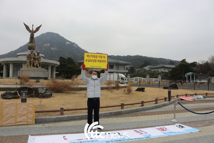 | ▲ 22일 청와대 앞에서 여행업 생존 비상대책위원회 오창희 공동위원장이 여행업계에 대한 재난지원금 지원 및 손실보상법 제정을 촉구하고 있다. |