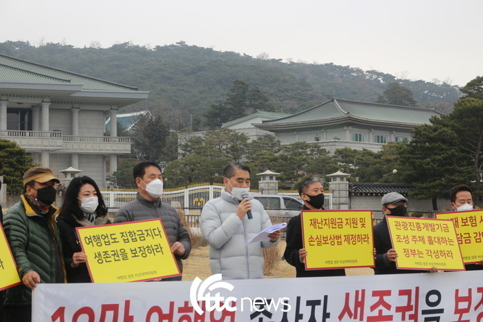 ▲ 22일 오전 청와대앞에서 여행업생존 비상대책위원회 공동위원장인 오창희 한국여행업협회장(가운데)이 "10만 여행업 종사자 생존권을 보장하라"는 성명을 발표하고 있다.