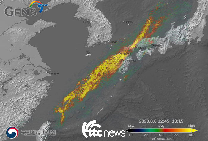 | ▲ ‘20.9.9,한국 정지궤도 위성 아황산가스(SO2)대기 전체층 농도(사진=국립환경과학원 제공) |