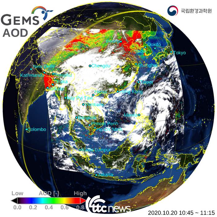 또한, 기존 국외 저궤도 위성에서는 관측이 되지 않거나 다량의 구름으로 일부 지역 관측이 누락된 반면, 한국의 정지궤도 환경위성은 아시아 전역이 골고루 관측되는 것으로 확인됐다.