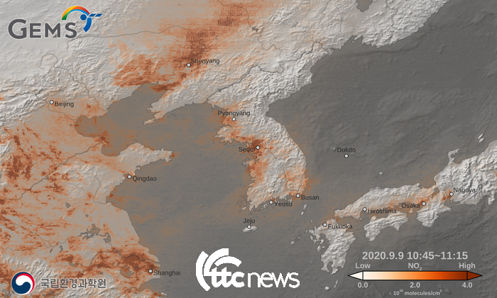 특히, 올해 9월 9일 관측자료에 따르면, 중국뿐만 아니라 동북아 전역에서 차량 이동이 많은 서울, 북경, 오사카 등 대도시와 화력발전소를 포함한 공업지역을 중심으로 이산화질소(NO2) 농도가 높게 나타남을 확인할 수 있다.