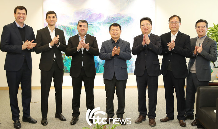 | ▲ 한국수자원공사 윤석대 사장(왼쪽에서 네 번째)은 4일 오전 대전시 대덕구 본사에서 딜쇼드 아지모프 우즈베키스탄 상하수도공사 사장과 만나 우즈베키스탄 물 문제 해결을 위한 지식 및 기술교류 확대 필요에 대한 의견을 교환하고 양 기관 관계자들과 기념사진을 촬영하고 있다.(사진=한국수자원공사 제공) |