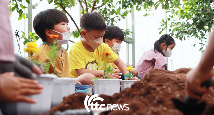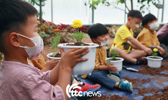| ▲ 10일 오후 경남 함양군 농업기술센터 아열대식물원에서 열린 ‘어린이 화훼체험 교육’에 참여한 금반초등학교와 병설 유치원 어린이들이 노란 꽃 화분 만들기 체험을 하고 있다.(사진=함양군 김용만 주무관 제공) |
