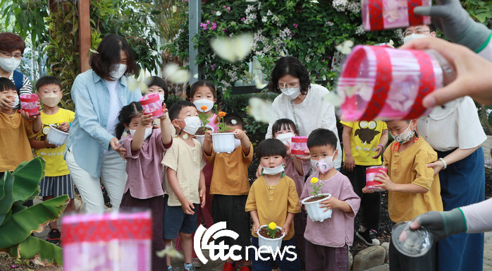 | ▲ 10일 경남 함양군 농업기술센터 아열대식물원에서 열린 ‘어린이 화훼체험 교육’에서 금반초등학교와 병설 유치원 어린이들이 나비 날리기 체험을 하고 있다.(사진=함양군 김용만 주무관 제공) |