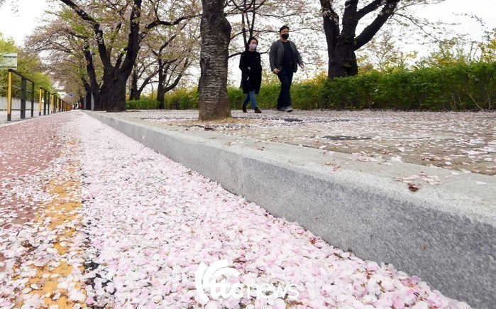 지난 한 주간 세상을 밝게 장식한 찬란한 벚꽃이 땅으로 내려와 봄 길을 떠나고 있다. 여의도 국회의사당 옆 여의서로 벚꽃길에는 마지막 봄 나들이객들이 이 봄 벚꽃 추억을 만들기 여념이 없다.