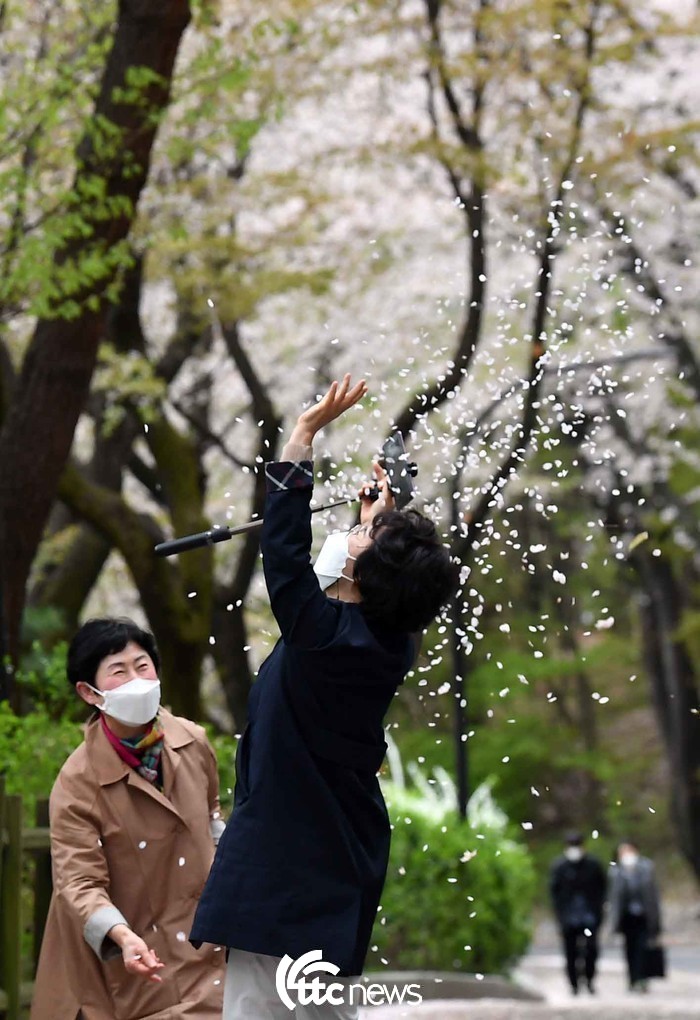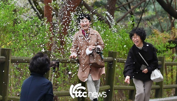 한편, 서울 남산 남측순환로의 벚꽃 길에서 만난 김영희(47)씨는 “꽃이 나무에 달렸을 때에만 예쁜 줄 알았는데, 바람에 날릴 때는 장관이더라, 또 땅에 떨어진 무수한 꽃잎 또한 아름답더라”면서 언니들과 함께 연신 사진 찍으며 봄날의 추억 만들기에 웃음 꽃이 넘쳐 난다.