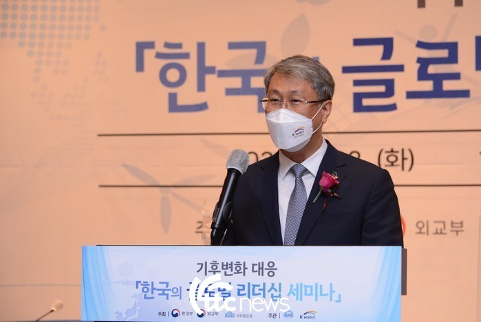 | ▲ K-water 이종진 글로벌사업본부장이 28일 오후 서울 중구 소재 신라호텔에서 열린 ‘기후변화 대응을 위한 한국의 국제 리더십 세미나’에서 발제하고 있다. |