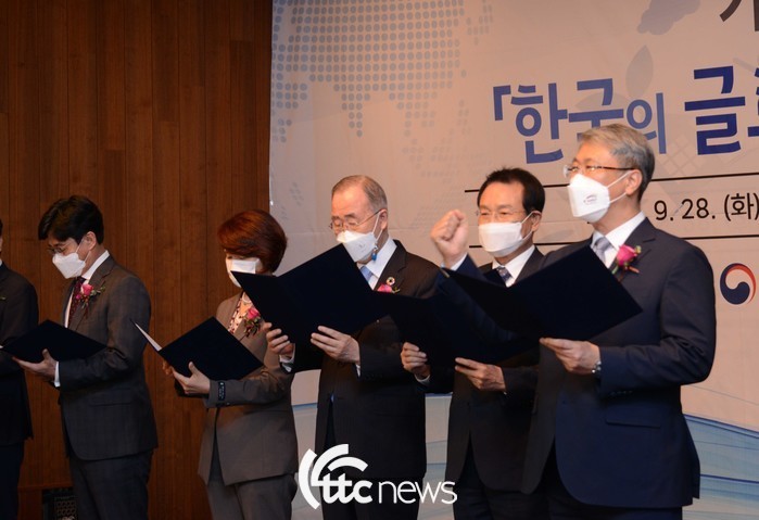 | ▲ 28일 오후 서울 중구 신라호텔에서 열린 ‘기후변화 대응을 위한 한국의 국제 리더십 세미나’에서 (오른쪽 부터) 박재현 아시아물위원회 회장,변재일 국회의원(국회물포럼 회장), 반기문 글로벌녹색성장연구소(GGGI) 의장(제8대 유엔사무총장),한정애 환경부 장관,최종문 외교부 제2차관, 유종일 한국개발연구원(KDI) 국제정책대학원장 등이 기후위기 대응 협력 선언문을 발표한 후 기념촬영하고 있다. |