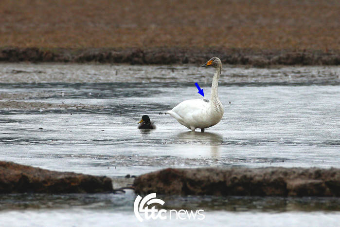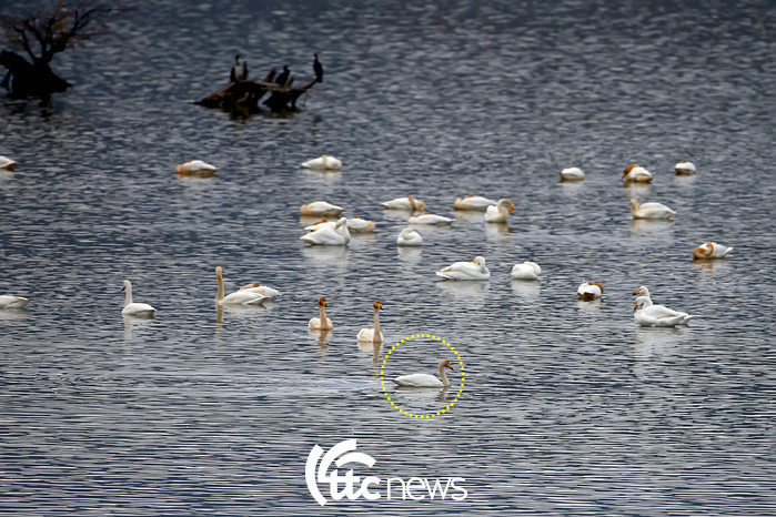 | ▲ 주남저수지에서 확인된 위치추적장치 부착 천연기념물 큰고니_ⓒ국립문화재연구소 |
