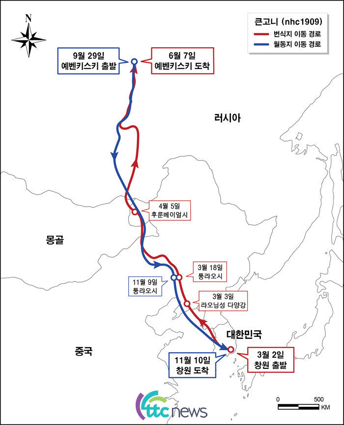 경남 창원 주남저수지에서 겨울을 보내고 봄이 되면 주남저수지를 떠나는 큰고니(천연기념물 제201-2호)의 이동 경로가 확인되었다.