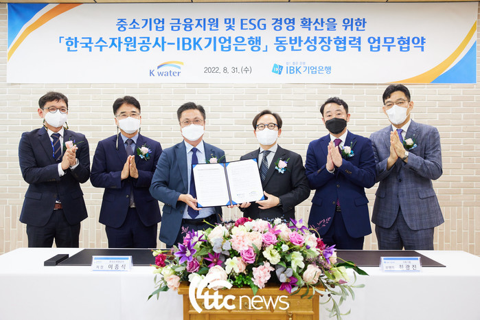한국수자원공사는 물산업 경쟁력 강화와 ESG 가치 경영 확산을 위해 8월 31일 IBK기업은행과 ‘중소기업 금융지원 및 ESG경영 확산을 위한 동반성장협력 협약’ 체결했다.