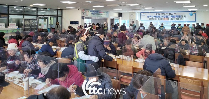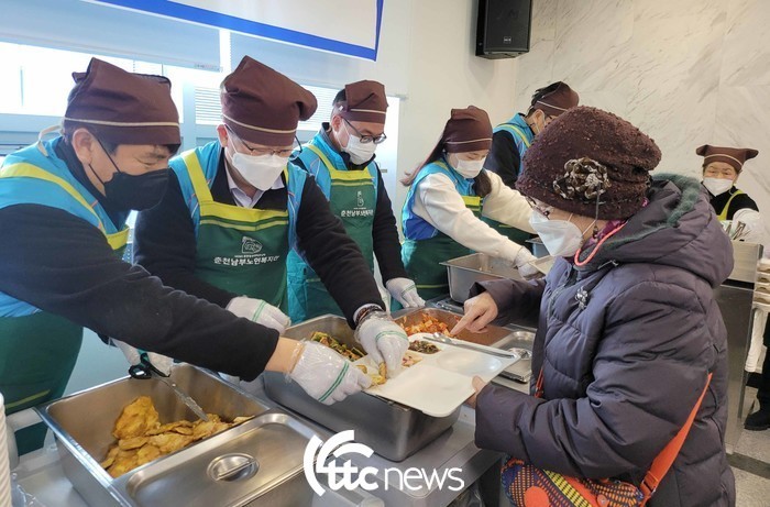“맛있게 드시고 건강하세요” 황선민 한국수자원공사 강원지역협력단장과 직원들이 18일 설 명절을 맞아 지역 어르신들의 급식지원 행사를 가졌다.
