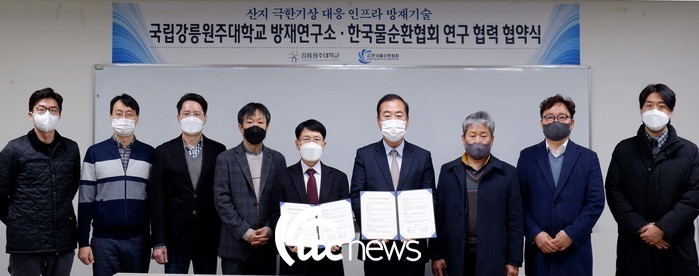 사단법인 한국물순환협회와 국립강릉원주대학교 방재연구소는 10일 강원도 강릉시 국립강릉원주대학교 방재연구소에서 ‘산지 극한기상 대응 인프라 방재기술 연구’ 업무협약을 체결했다.