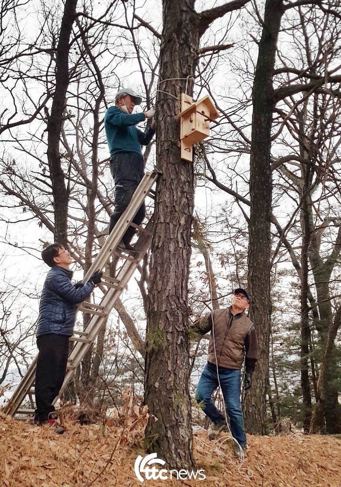 | ▲ 경기도 이천시 호법면 동산리 어귀 작은 공원에서 인공새집을 달아주는 김완기(79, 사다리 위) 씨 |