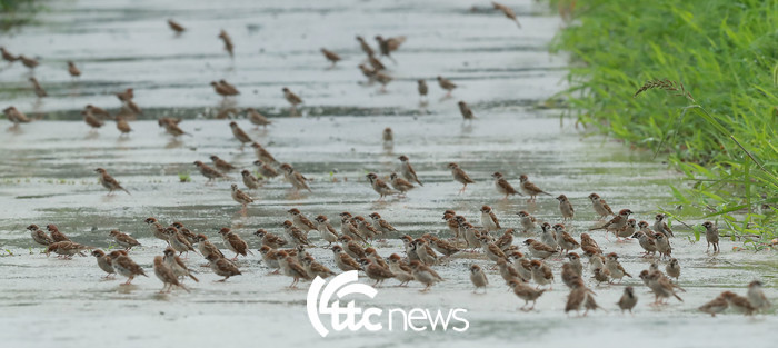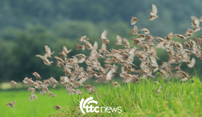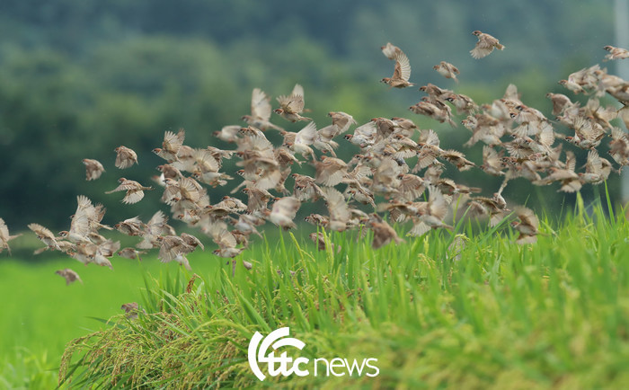 입추를 하루 앞둔 6일 오후 경남 함양군 함양읍 한들 들녘에서 벼 이삭을 쪼아 먹던 참새들이 인기척에 놀라 날아가고 있다.