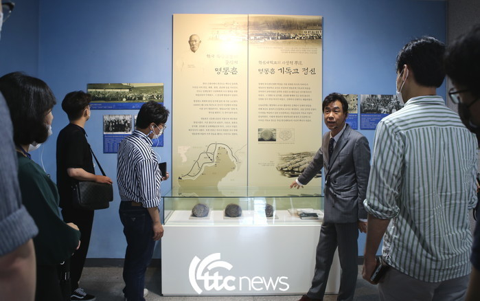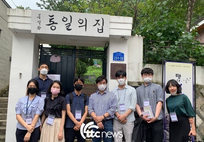 | ▲ 서울캠퍼스에서 새싹직원들이 ‘북간도 명동촌’으로부터 시작한 한신대의 뿌리에 대해 설명을 듣고 있다.(사진=한신대 제공) |