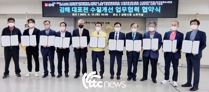 김해시, K-water, 인제대학교 등 11개 기관이 12일, 김해시청에서 김해 대포천의 수질개선을 지원하고 수생태계 복원 및 보전방안을 모색하기 위한 공동협약식을 개최했다.