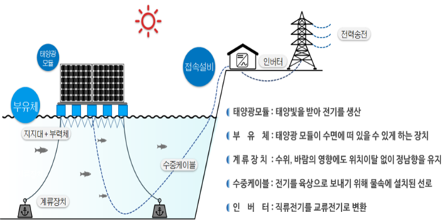 | ▲ 수상태양광은 태양빛을 받아 전기를 생산하는 태양광 모듈, 모듈이 수면에 떠 있을 수 있게 하는 부유체, 모듈과 부유체를 바람, 수위 등 외력에 대응하여 정남향을 유지하게 하는 계류장치, 그리고 생산된 전기를 보내는 전기설비(케이블, 인버터 등)로 구성되어 있다(그래픽=수자원공사 제공) |