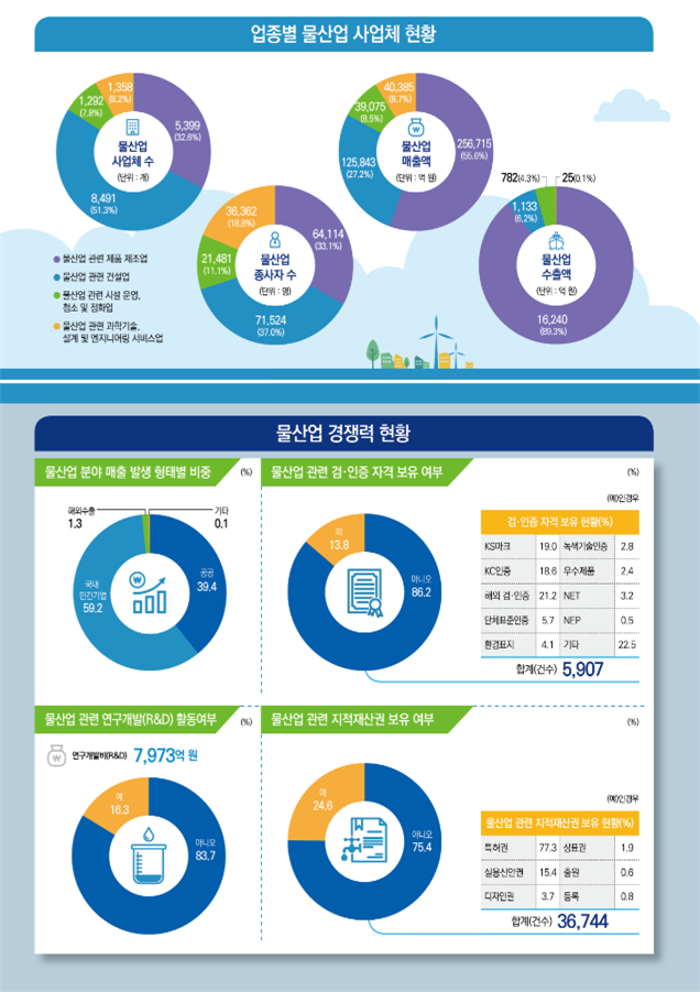 다만, 해외진출 사업체는 총 313개 사로 전체 물기업 중 약 1.9%에 불과하다. 연구개발(R&D) 활동기업은 전체 물기업 중 약 16.3%로 추산되어 산업의 경쟁력을 높이기 위해서는 앞으로 물기업의 해외진출 및 연구개발 확대 등 관련 분야의 지원 필요성이 높은 것으로 조사되었다.
