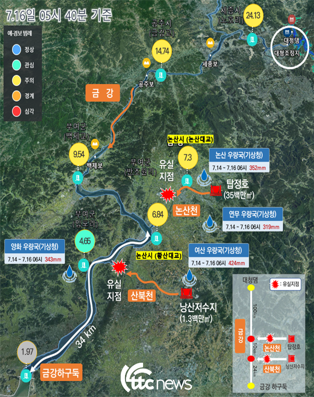 한국수자원공사는 17일 ‘대청댐 방류와 하류하천 영향 참고자료’를 통해 “최근 제방이 유실된 논산천(충남 논산시)과 산북천(전북 익산시)은 대청댐 방류량이 흘러가는 금강 본류가 아닌 지류하천으로 대청댐 하류 약 100~110km 지점”이라고 밝혔다.