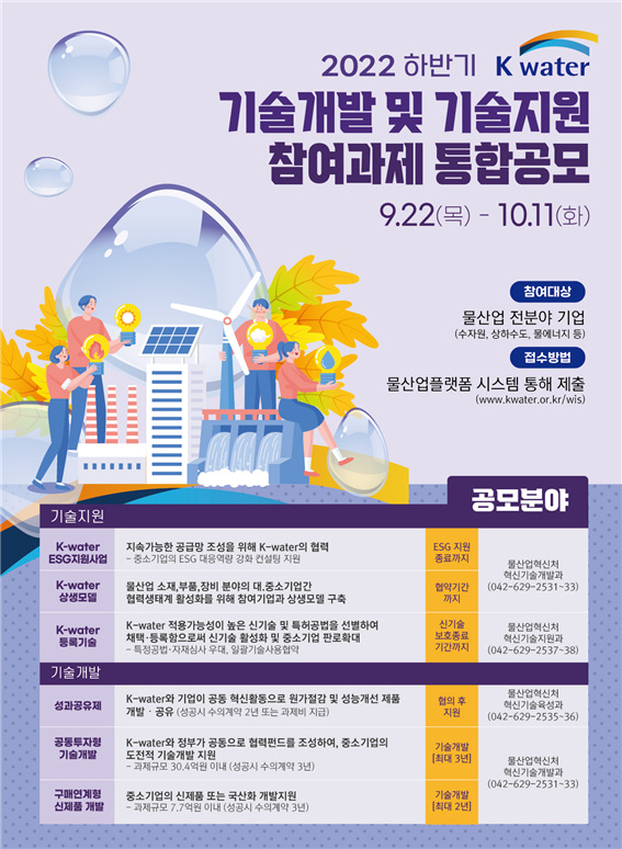 이번 공모는 물분야 혁신기술 육성 및 물산업 활성화 등을 위한 사업화 기술지원 및 기술개발의 6개 분야 통합공모로 올해 3월에 진행된 상반기 공모에 이은 두 번째 공모이다.