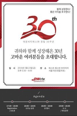 30주년 기념식은 서울 마포에 위치한 베스트 웨스턴 프리미어 서울가든 호텔에서 오후 5시 30분부터 오후 8시까지 진행될 예정이다. 기념식은 대원CTS 정명천 대표를 비롯 모든 임직원과 대원CTS와 함께 성장한 관련 업체 및 파트너사가 참석한 가운데 다양한 행사와 공연, 만찬의 시간을 가지며 기업 간 유대관계를 더욱 굳건히 하는 시간을 가질 예정이다.