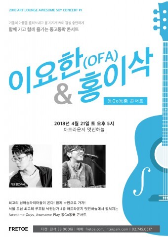 먼저 4월 21일(토) 오후 5시에는 신예 싱어송라이터들의 공연 <동Go동樂 : 이요한(OFA) & 홍이삭>이 열린다. 이요한과 홍이삭은 각각 Mnet <슈퍼스타K 7>과 <너의 목소리가 보여>를 통해 시청자들에게 강렬한 인상을 남기고 작곡, 작사, 프로듀싱까지 다 하는 실력파 뮤지션이다. 이번 공연은 이요한의 매력적인 중저음과 홍이삭의 감미로운 목소리가 돋보이는 어쿠스틱한 곡들로 채워질 예정이다. 입장권은 프레토 홈페이지 또는 인터파크에서 예매할 수 있으며 가격은 3만3천원이다.