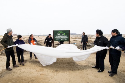 | 이브자리가 7일 서울 강서 한강공원 일대에서 시민 1000여명과 한강 탄소상쇄숲 조성행사를 개최했다. 신용준 이브자리 부회장(표지판 왼쪽 두 번째), 김인숙 서울시 한강사업본부 공원부장(표지판 왼쪽 세 번째), 정승교 한국중부발전 기술부사장 직무대행(표지판 오른쪽 세 번째) 등이 제막식을 하고 있다 |