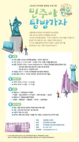 민주화운동기념사업회(이사장 지선, 이하 사업회)가 서울시교육청에서 주최하는 ‘민주체험 올레길’의 운영 주관 단체로 선정됨에 따라 서울시 청소년들을 대상으로 민주주의 현장탐방 프로그램 ‘민주야, 탐방가자’를 운영한다고 밝혔다.