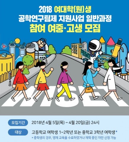 한국여성과학기술인지원센터(소장 한화진, 이하 WISET)가 여대학(원)생 공학연구팀제 지원 사업(이하 공학연구팀제) 일반 과정 연구팀에 참여하여 공학 분야 전공 체험과 관련분야 연구를 진행할 여중고생 팀원을 20일까지 모집한다고 밝혔다.
