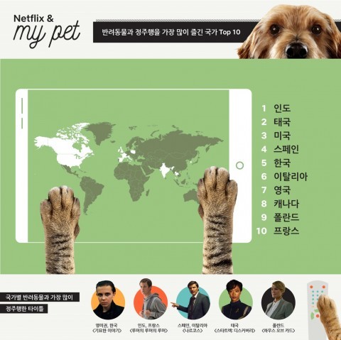 유독 반려동물과의 정주행을 선호하는 국가들이 있다. 늘 넷플릭스를 시청하기에 앞서 한 켠에 정주행 파트너로서 털 많은 친구들의 공간을 마련해놓는 회원들이 많은 국가는 어디인지 그리고 각국에서 반려동물과 즐겨 시청했던 타이틀들은 무엇이 있는지 소개한다. 참고로 74%의 회원들이 최고의 정주행 파트너로 반려동물을 선택했던 한국도 반려동물과 가장 많이 정주행하는 국가 5위에 순위를 올렸다.
