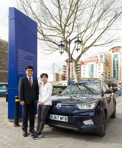 | 쌍용자동차 유럽사무소 김준범 소장(왼쪽)과 지소연 선수(오른쪽)가 영국 런던 첼시 홈구장인 스탬포드 브릿지(Stamford Bridge)에서 후원 협약을 체결하고 티볼리를 전달한 뒤 기념촬영을 하고 있다 |