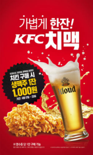 글로벌 No.1 오리지널 치킨 전문 브랜드 KFC가 17일부터 23일까지 치킨 메뉴를 구매하면 생맥주를 1000원에 제공하는 ‘KFC 치맥’ 프로모션을 진행한다고 밝혔다. 이번 프로모션은 맥주를 판매한 매장에서만 진행된다.