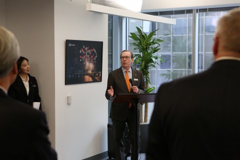 | 버나드 샴포 미국사업실장(가운데)이 지사 설립식에서 인사말을 하고 있다 |