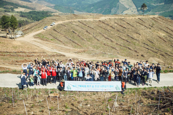 축구장 332개 면적이 소실된 강원도 삼척 도계읍 일대의 산불 피해 지역에 시민들의 참여를 통한 ‘산불 피해 복구 숲’이 28일 조성되었다.