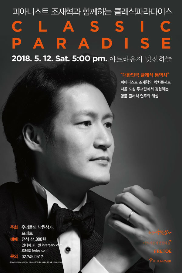 이어 5월 12일 오후 5시에는 피아니스트 조재혁의 감성 가득한 렉처 콘서트 ‘클래식 파라다이스(Classic Paradise)’가 열린다. 조재혁은 국내뿐만 아니라 해외에서도 큰 사랑을 받고 있으며 뛰어난 테크닉과 섬세한 감성이 돋보이는 피아니스트다. 이번 콘서트에서는 작년에 이어 두 번째 열리는 공연으로 조재혁의 명품 피아노 연주와 섬세한 해설을 감상할 수 있다. 평소 클래식을 어렵고 낯설게 느꼈던 사람들에게 재미있고 쉬운 해설으로 클래식에 대한 이해를 도와주고 평소 클래식을 즐겨 듣는 사람들에게는 로맨틱한 시간을 선사할 예정이다. 입장권 가격은 4만4천원이다.