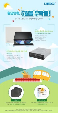 이에 저장 장치 전문 브랜드 라이트온(Lite-On)의 공식 파트너인 ㈜태진금속(대표이사 안태균)이 ODD 유통 파트너 ㈜이선디지탈(대표이사 정현수)과 함께 원하는 콘텐츠를 마음껏 담아 즐길 수 있는 라이트온 초경량 & 초슬림 외장형 ODD 및 내장형 ODD 구매 고객 대상으로 ‘황금연휴, 5월을 부탁해!’ 경품 이벤트를 진행한다.