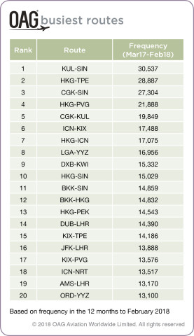 쿠알라룸푸르-싱가포르 노선이 2017년 3월부터 2018년 2월까지 12개월 간 3만537편의 운항 편수를 기록하고 OAG의 가장 바쁜 국제 노선(OAG Busiest International Routes) 상위 20개 중 1위를 차지하면서 세계에서 가장 많은 항공기가 오가는 항로인 것으로 확인됐다.