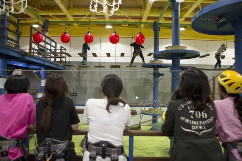 | 국립평창청소년수련원 챌린지 타워장에서 스쿨업캠프 참가 청소년들이 챌린지활동 프로그램을 체험하고 있다 |