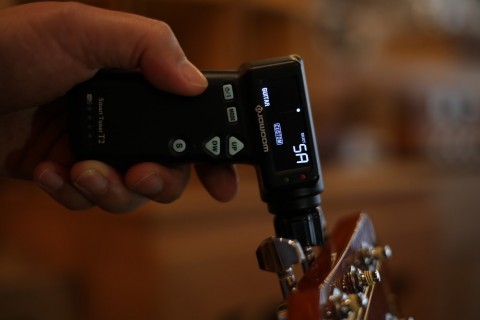 | 스마트 자동 튜너 Jowoom T2를 이용해 기타를 조율하고 있다 |