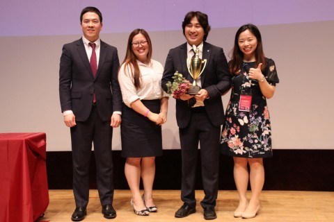 | 2018년 한국 토스트마스터즈 영어 스피치대회 우승자 오자형(Angeles Oh, 왼쪽에서 세 번째) 씨가 스피치대회 시상자들과 함께 포즈를 취하고 있다 |